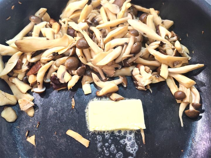 5.  4のきのこ類に焼き色がついてきたら、バターを加えます。きのこ類の旨味をしっかりと出すため、焼き色がつくまで辛抱強く炒めるのがポイントです。