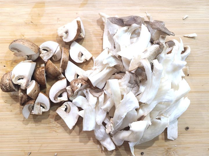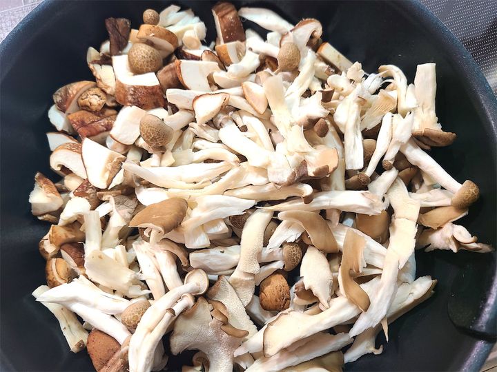 3.  マッシュルームもしいたけと同じくらいのサイズに切り、エリンギは食べやすい大きさに割いておきます。