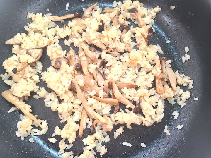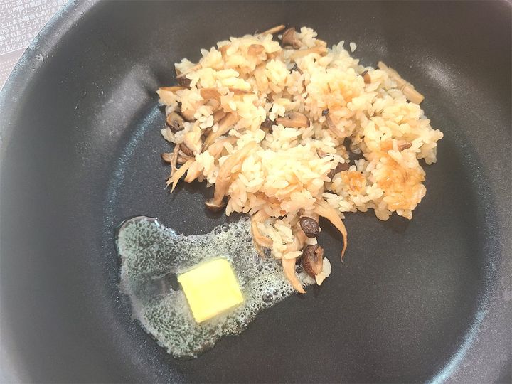 動画では、炊き上がったきのこご飯のアレンジメニューも紹介されていたので、作ってみましたよ♪作り方は簡単、炊き上がったきのこご飯をバターで炒めるだけ!
