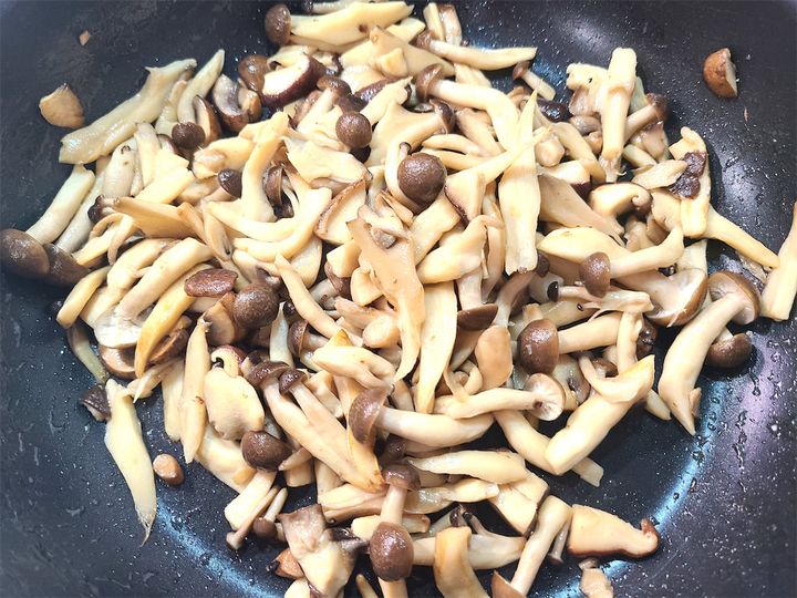 4.  フッ素樹脂加工のフライパンに油を引かず中火にかけ、23のきのこ類を入れて炒めます。量が多いように思えますが、炒めているうちに嵩が減りますので安心してください。