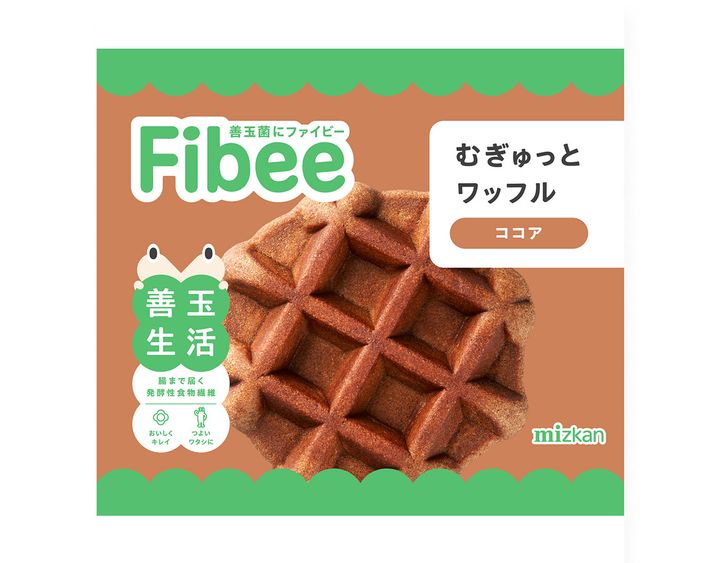 むぎゅっとワッフル(ココア)。やさしいココア味です。1個あたりの発酵性食物繊維は4.3g(分析例)。