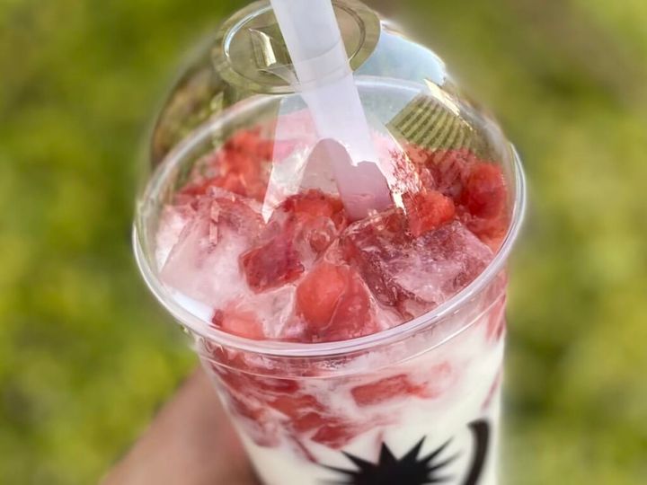 ただ、正方形の氷がたっぷり入れられているので、ドリンク自体の量が少なく、全体を混ぜるにかなり苦労します。また、氷がありすぎて、カップの底に沈殿したいちご果肉を吸うのも一苦労。飲み始めた瞬間はよいですが、後半は飲みにくさを感じました。