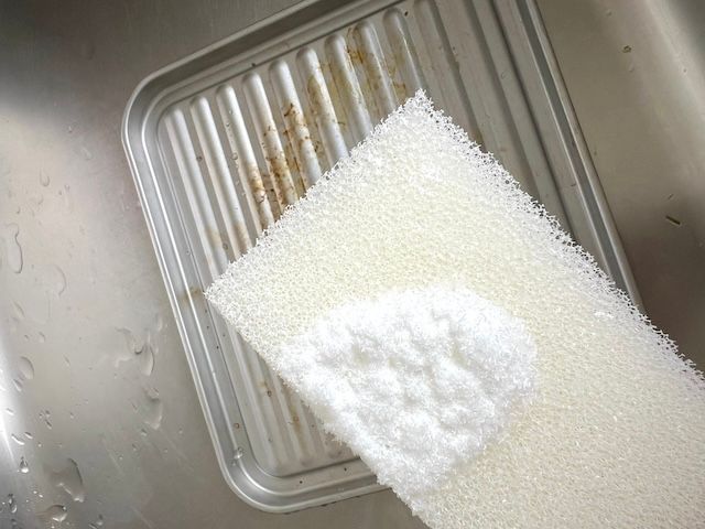 ぬらしたスポンジにセスキをかけて油汚れをこすってみました。