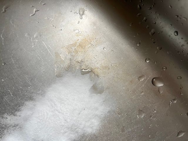 シンクの着色汚れを重曹で落としてみます。汚れに直接重曹を振り掛け濡らしたスポンジでゴシゴシ擦ってみると…。