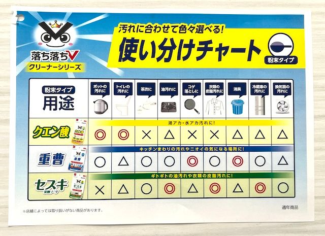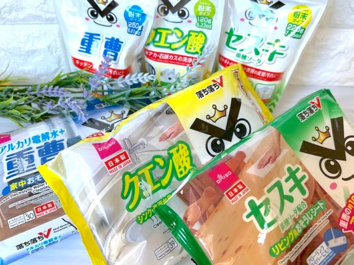 【ダイソー 掃除】「落ち落ちV」早見表! 重曹、セスキ、クエン酸はそれぞれどんな汚れに効く?