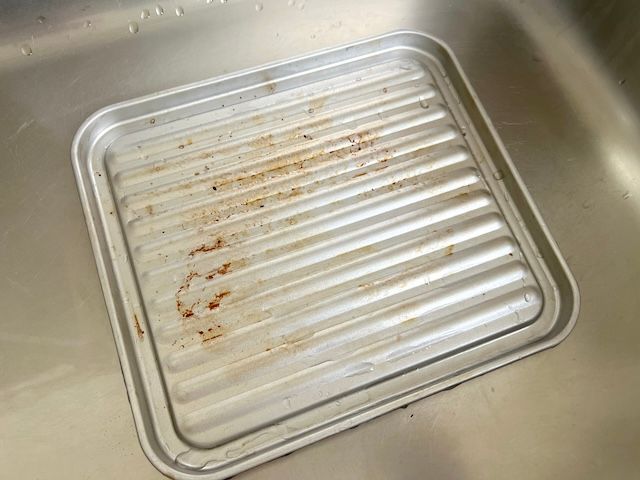 油汚れでベトベトのトースターのトレー。こちらは粉末タイプのセスキで磨いてみます。油の汚れなので触ってみるとベトベト…。
