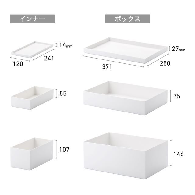 インナー(深型・浅型・トレー)、ボックス(深型・浅型・トレー)のあわせて6型の組み合わせで、自由に使えます。色はホワイト・クリア・グレーの3色展開。