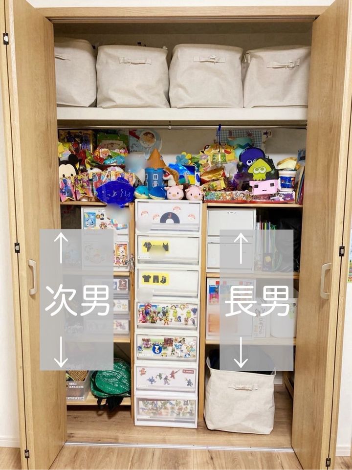 子どものクローゼット収納で意識したいポイントは、「自分だけのスペース」を作ってあげること♪クローゼットの右側を長男、左側を次男のスペースにしています。