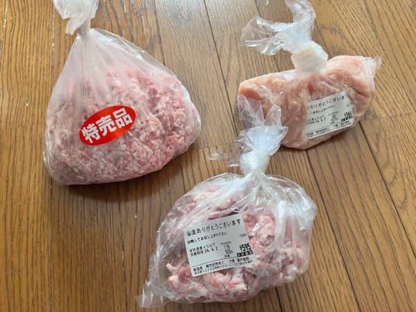 この日は『お買い得』とホワイトボードにあった豚ひき肉1キロの袋詰めと、豚切り落とし肉、そして鶏ひき肉を買って帰り、豚ひき肉は3等分して冷凍しました☆