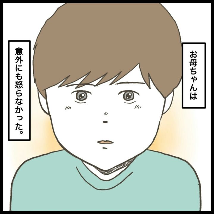 イチくん親子がお互いを思いやる気持ちが、とてもすてきですね。彼は、叱られるとばかり思っていたので、お母さんの優しさに驚いています。