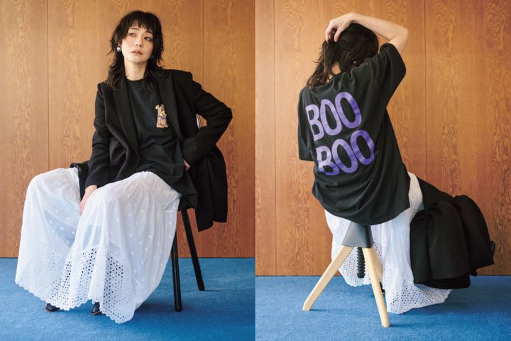 バックプリントでユーモアを。Tシャツ※メンズ[SIZE:XXL]¥7,800(Long Beach OMOTESANDO)、中に着たドレス¥127,600(マラン エトワール/イザベル マラン 青山店)、ジャケット¥68,200(パルマン)、イヤリング¥15,400(ケネス ジェイ レーン/シティショップ)、ロングブーツ¥88,000(カチム)