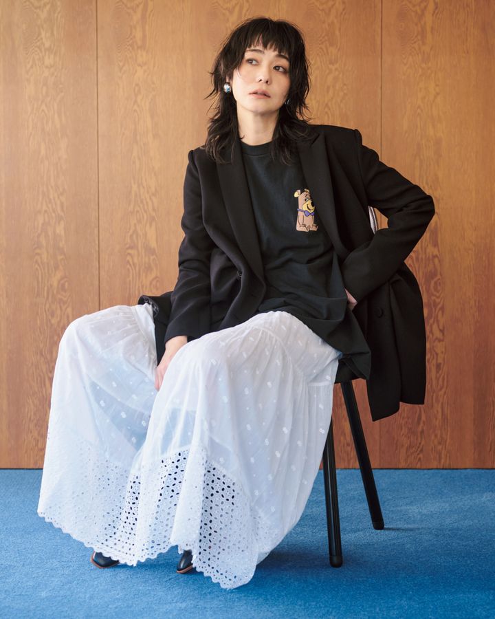 メンズやユニセックスのプリントTは、主張が端的で爽快感がある。さらにメンズ特有の色気のないストンとしたシルエットで、気負わずに着られるのがいい。たっぷりとしたサイジングだから、脚が見えるとアクティブ過ぎて幼く見えがちなのでボトムはロング丈を。キレイめなジャケットも好相性。