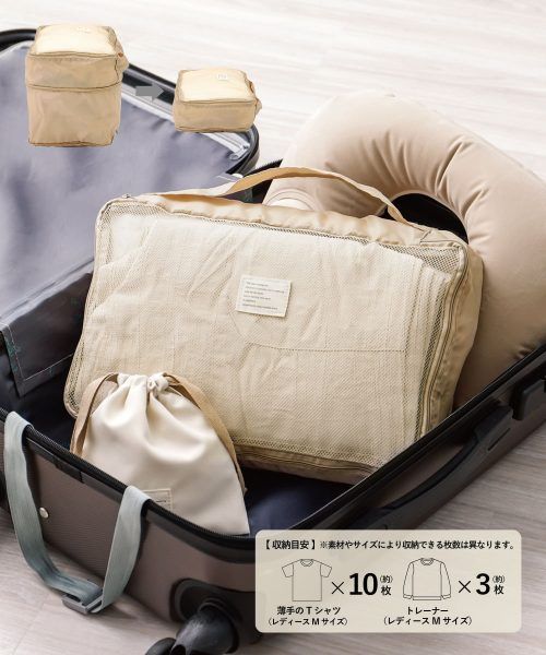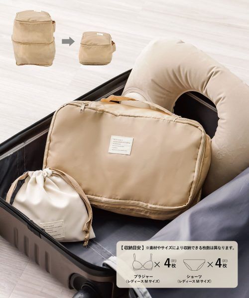 中身が見えない仕様になっているランジェリー圧縮バッグ。中にミニポケットが付いていて、ボディケア用品などを入れることができるのでお風呂に入りに行くときにも便利です。