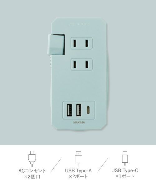 2つのACコンセントと2つのUSBポート、Type-Cポートが1つ付いている便利な電源タップ。家族分のスマホ、タブレットなどを充電するときにコンセントが足りない問題が解決する便利なアイテムです。旅行時だけではなく、家でも大活躍してくれること間違いなしです。