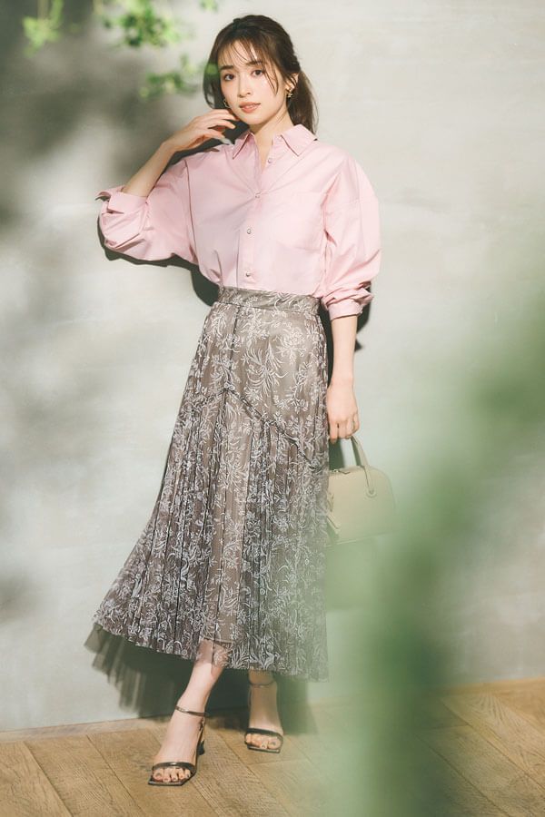 きちんと感あるシャツならいつものピンクコーデが凛とした華やぎに転身。抜け感のあるシアー素材が今っぽい「ストラ」のスカートは、大人な魅力漂うボタニカルなフラワープリント。ニュアンスブラウンも相まって、甘めアイテムの花柄スカートをほどよい甘さに調整してくれます。