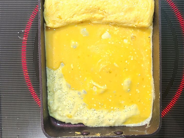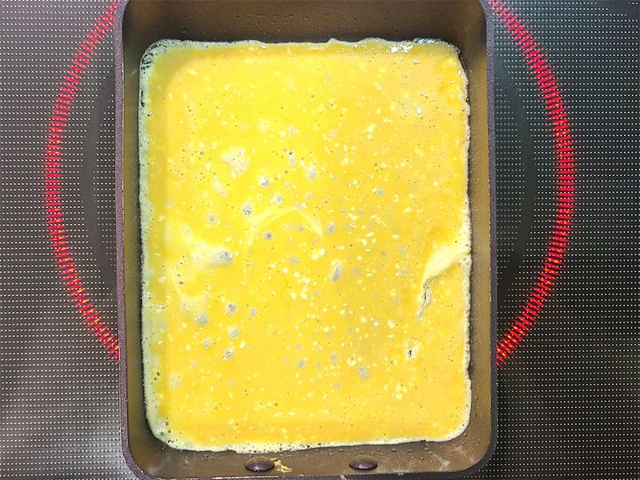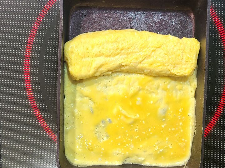 5. さらにフライパンに油(分量外)を引き、2回目の卵液を入れます。1回目に巻いた卵焼きの下に卵液を入れないようにするのがポイント!フライパンに卵液を入れたらすぐに巻きます。