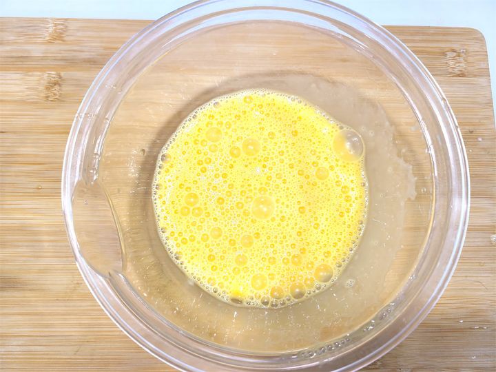2. 別のボウルに卵を割り入れ、空気を含ませるようにしながらよく溶き、1と砂糖、しょうゆを加えさらによく混ぜます。