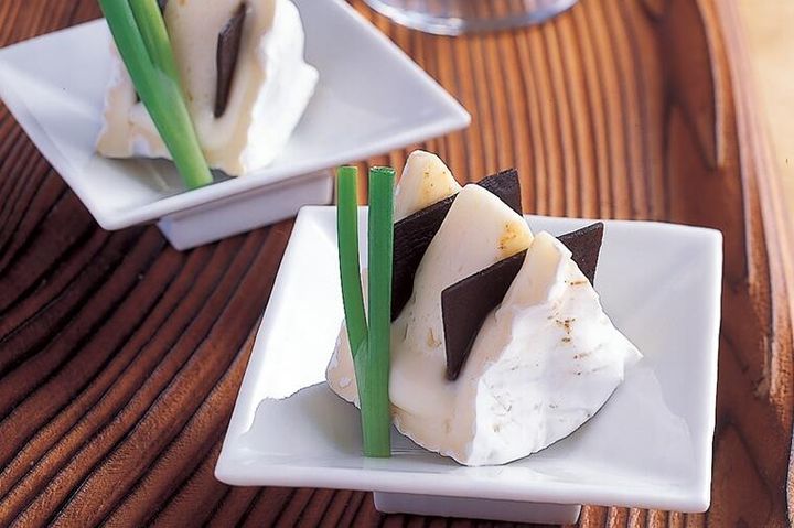 切ったカマンベールチーズに塩昆布を挟んだシンプル料理だが、チーズと昆布それぞれの旨味成分が相乗効果となって複雑な味わいに。