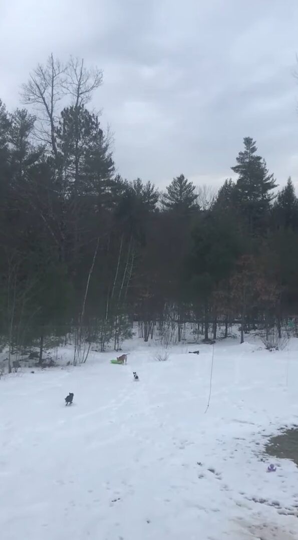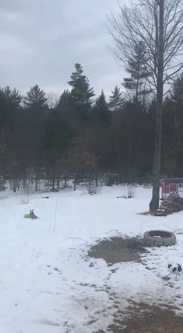 どんどん雪の中を滑っていく姿はとても楽しそう。 そして、その後ろを2匹の犬が追いかけていきます。 この子たちもソリ遊びがしたいのでしょうね。