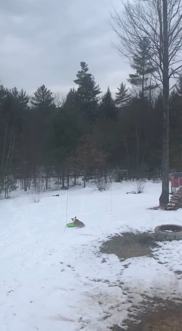 愛犬はそのオモチャの上に乗ると、雪の上をそのままスーッと滑っていきました! そう、フリスビーではなくソリだったんですね!!