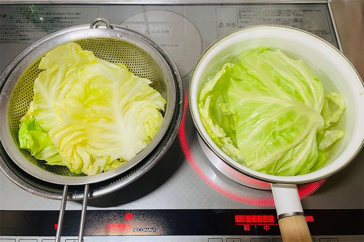 1.キャベツは茹でてザルにあげ冷ましておく。