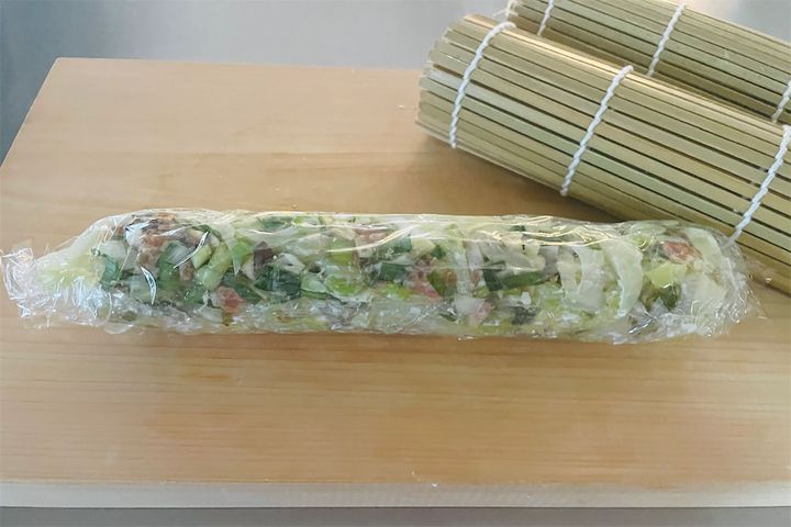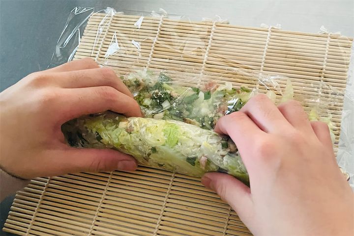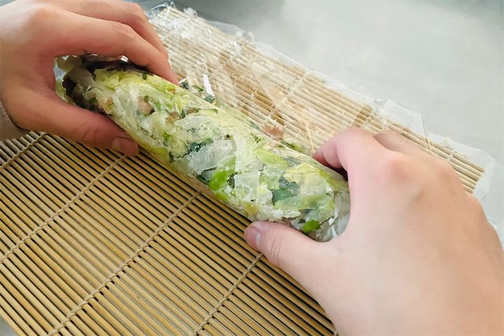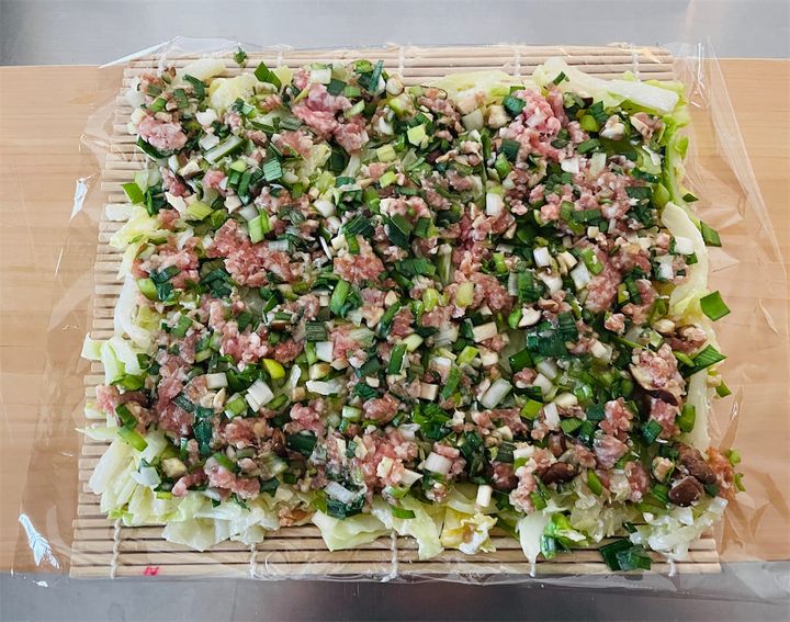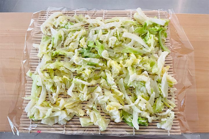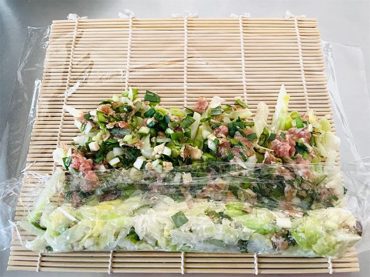 6.巻きすの上にラップを敷き、5のキャベツ、その上に3の肉だねを広げ、のりまきのように巻き形を整える。
