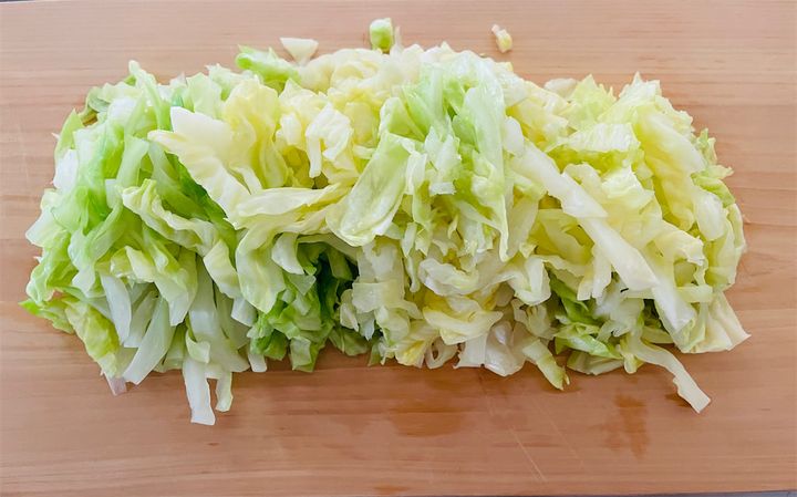4.キャベツが冷めたら、細切りにする(葉・脈の厚いところは、そぎ切りにしてから細切りにする)。