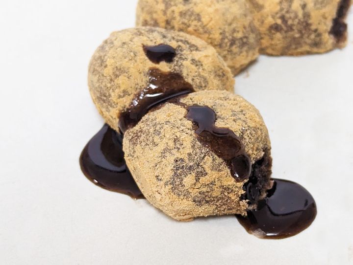 こちらはきなこシュガーがたっぷりとまぶされて、別添えの「ほうじ茶蜜」をかけて食べます。
