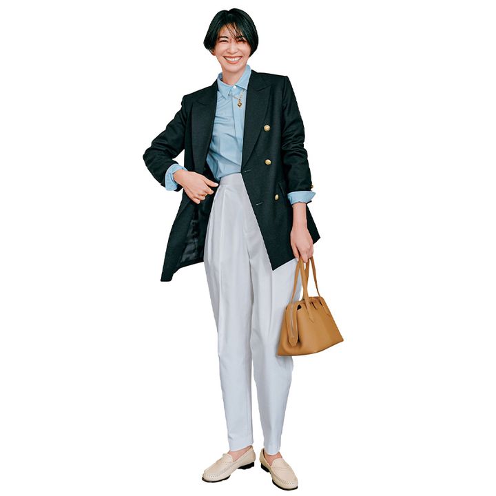 シャツ¥20,900(エーケー ワン/ビームス ハウス 丸の内)ジャケット¥55,000(ウィム ガゼット/ウィム ガゼット玉川髙島屋S・C店)バッグ¥53,900(ヴァジック/ヴァジックジャパン)ローファー¥77,000(ヘリュー/アルアバイル)ネックレス¥33,000(ローラ ロンバルディ/八木通商)リング¥18,700(ジュエッテ)