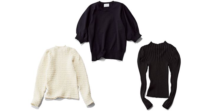 まだ肌寒さの続く春は、薄手ニット1枚で過ごすのも手。今回は、太って見えない構築的なデザインを厳選。着回しの効くモノトーンでお届けします!