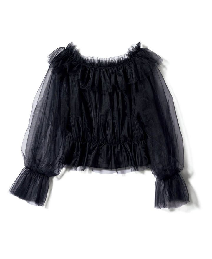 ほんのり透けるブラックチュールが大人見え。襟元のフリルで顔まわりも華やかに。