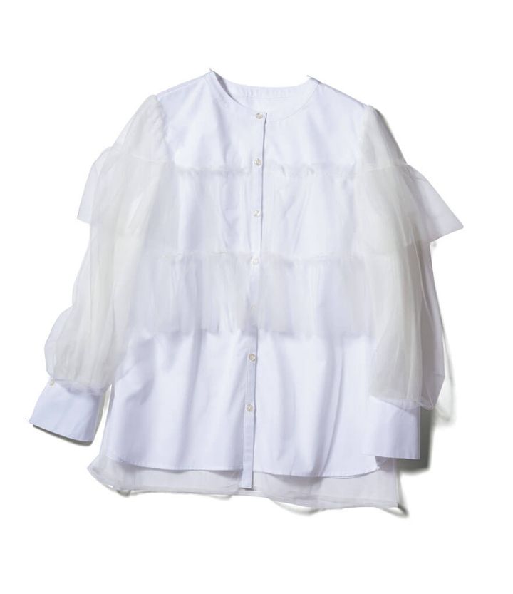 シンプルベーシックなバンドネックシャツをティアード状の白チュールで味付け♡ いつもとは一味違ったシャツコーデを楽しんで♪