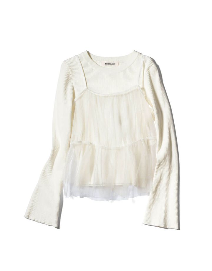 ふんわりとしたシルエットで気になる体型もカバー。リブニットに重ねたチュールキャミでイマドキなニュアンスを手に入れて。