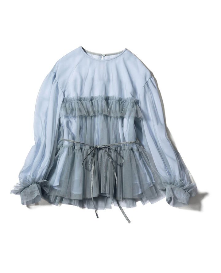 チュールビスチェをレイヤードしたようなデザインブラウスは1枚で主役級の存在感。甘めのチュールもグレーなら大人見え。