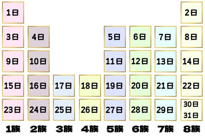 まずは表から自分の誕生日を探してください。その数字が書かれている縦列があなたの属する運命周期のグループです。例えば9日生まれの人は1族で、26日生まれの人は4族です。