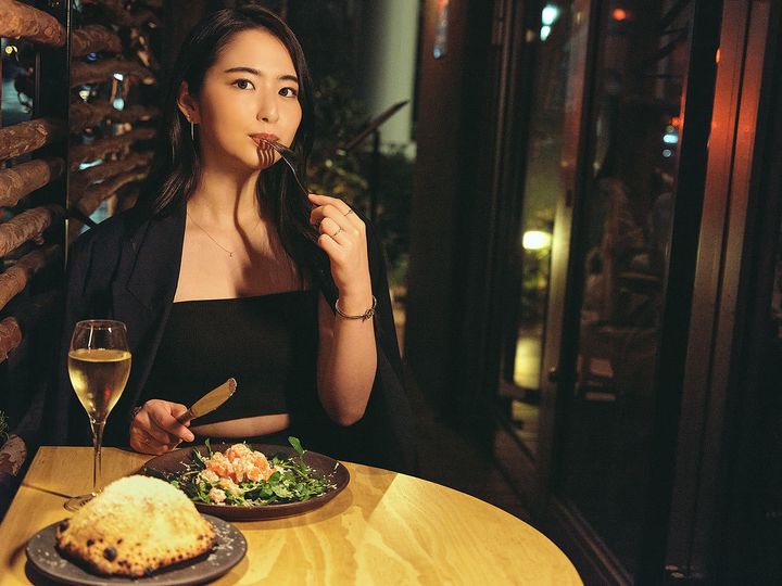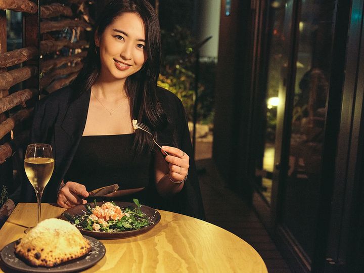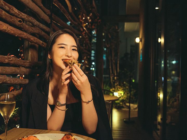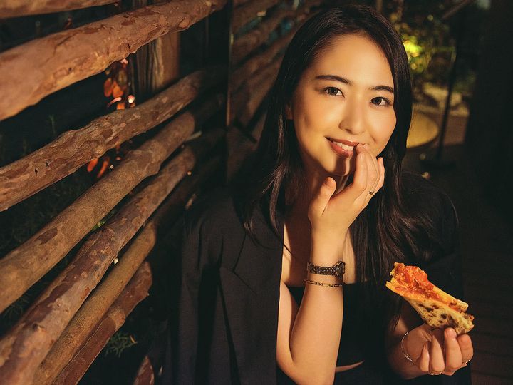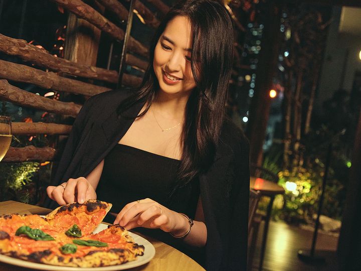夜風に吹かれる気持ちいいテラスで、彼女のように“泡とピザ”を堪能してほしい。
