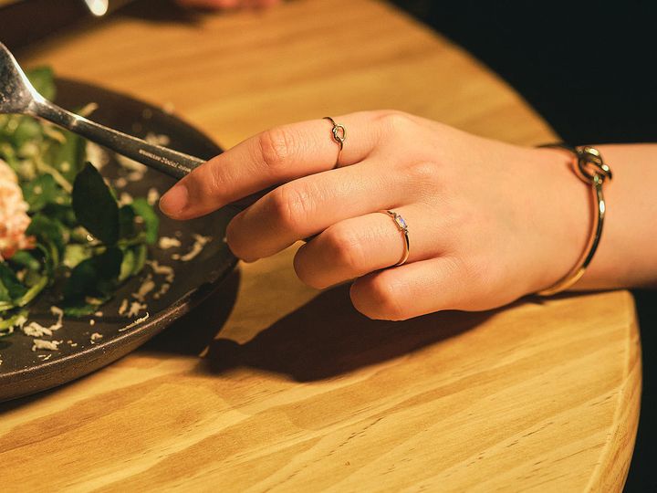 ブレスレットはセリーヌ。人さし指のリングは、鎌倉にある自分でリングが作れるお店・gramで作りました。薬指のリングはアガットです