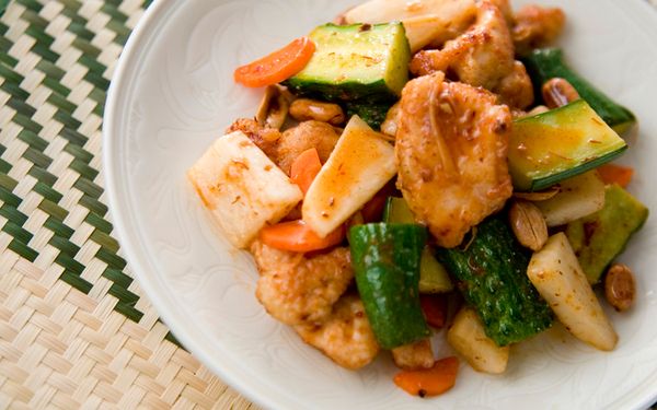 ニンジンやキュウリなど、カリカリ食感が楽しい野菜を使った炒め物。揚げ焼きにしたピーナッツをトッピングすることで、より食感が引き立ちます。味付けはxo醤がベース。風味が強いため、少量でも満足できる味に仕上がります。