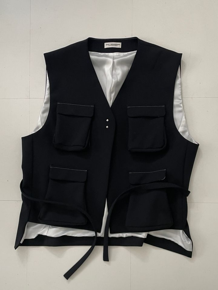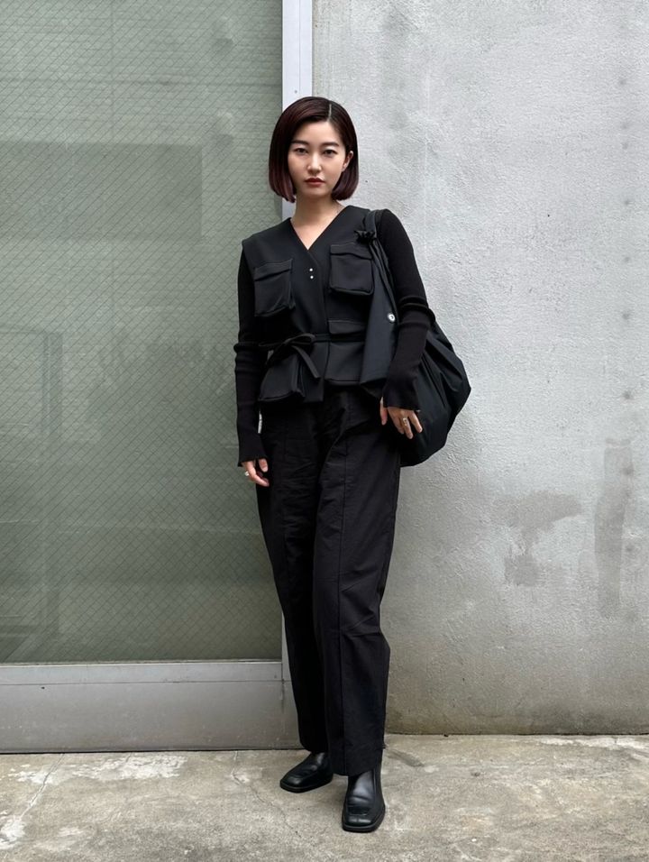 「削ぎ落としたシンプルなコーディネートにデザイン性のあるベストを合わせたオールブラックスタイル。モノトーンコーデは私にとって制服のようなもので、今回のようにミニマルなスタイルにギミックがきいたアイテムをワンポイントに合わせることが多いです」