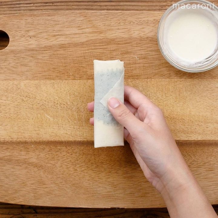 3: 春巻きの皮の手前に②、梅をのせて巻き終わりの方に大葉を置き、巻き上げて閉じ目に水溶き小麦粉をぬって閉じます。