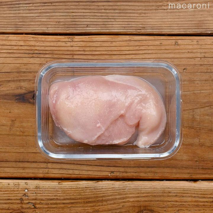 1: 耐熱容器に鶏肉を入れて、フォークで数カ所刺したら(a)を揉み込みます。