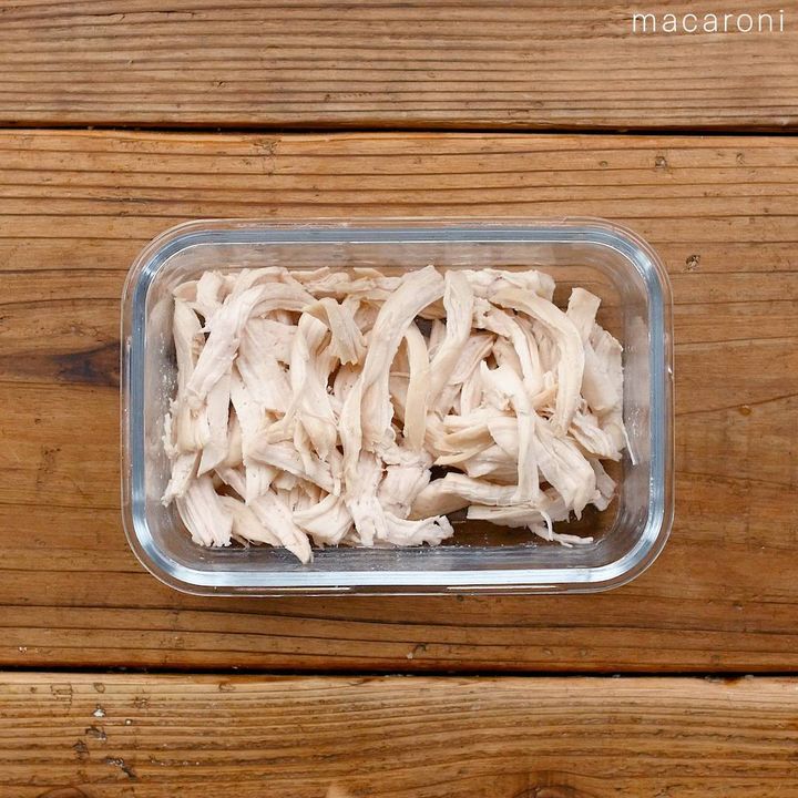 鶏肉は粗熱を取ってから手で食べやすい大きさに割いてください。
