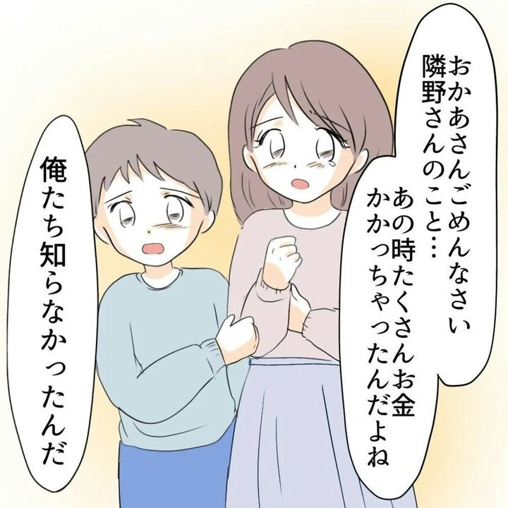 子どもを信じるのか、怒鳴り込んでくる隣人の主張を聞き入れるのか悩みながら、主人公夫婦は費用を支払う決断をします。しかし、のちに隣野さんの主張には裏があり、最初から主人公一家からお金を取るためにうその主張をしていたことが判明するのです。