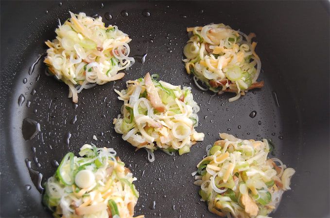 4. フライパンに軽く油を引き、火にかける前に、3をスプーンですくって入れ、ひと口大くらいの円形に成形します。