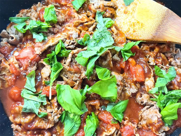 4.塩、こしょうをし、バジルをちぎって加えます。トマトの甘味が足りないと感じたら、ここで砂糖を加えて調整してください。わたしはトマト缶を使用しましたので、砂糖を大さじ1加えました。