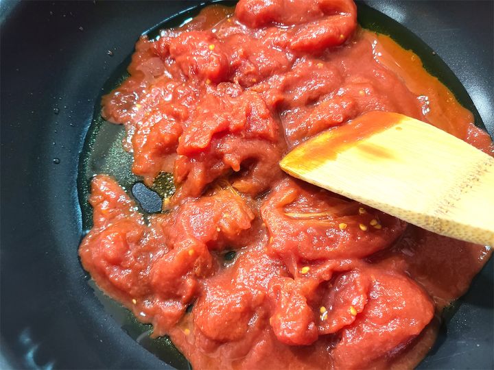 2.中火に熱したフライパンにオリーブオイルを引き、トマトを炒めます。大きいものは少し崩しながら炒めるといいですよ!