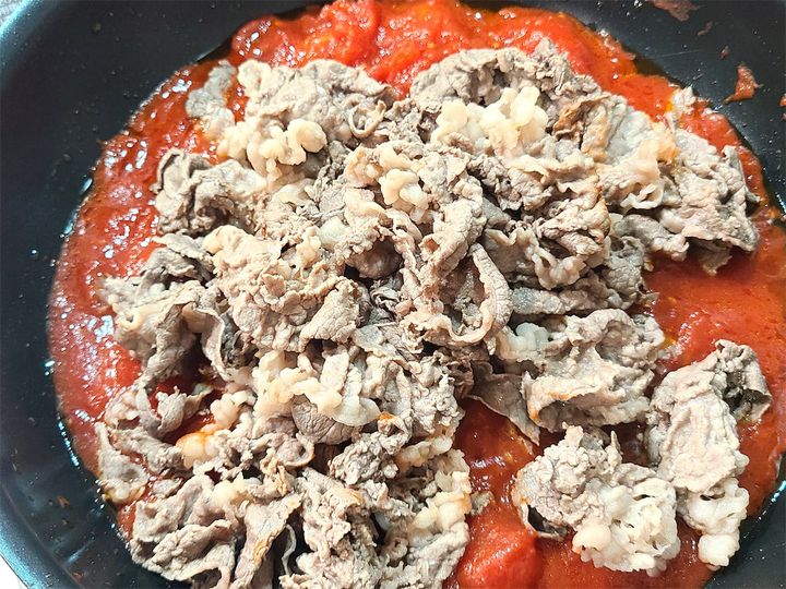 3.全体的にトマトに火が通ったら、牛肉を加えて混ぜ合わせます。