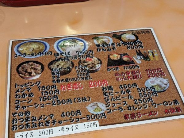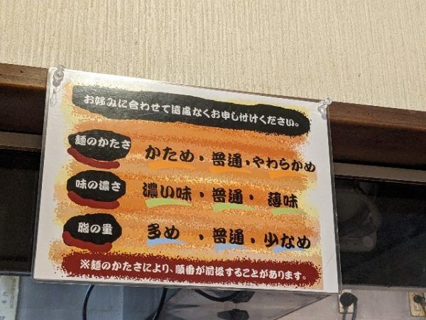 自分の好みに合わせて『麺のかたさ』『味の濃さ』『脂の量』を選択可能。これを見るかぎり『家系ラーメン』のお店だと想像します。店名にも「家」がついているし…。初めておじゃましたので、今回は全て『普通』で注文。