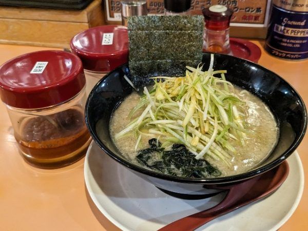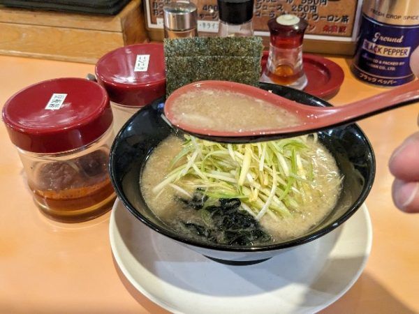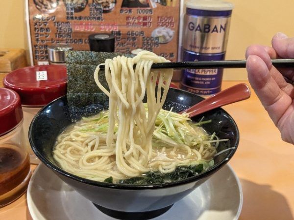 私が知っている家系の中では、あっさり系で塩味も控えめ。ゴマ油をまとった千切りのネギもそう思わせるポイントかもしれません。