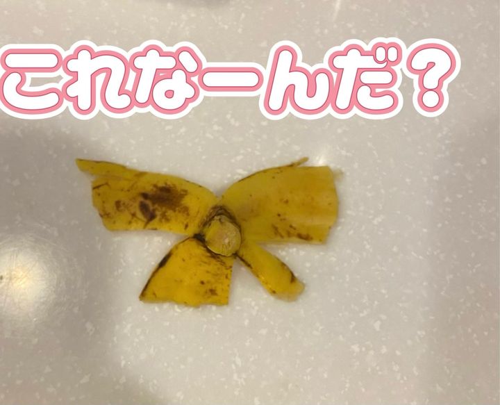 朝ご飯で食べ終わったバナナの皮をヒラヒラさせる娘。